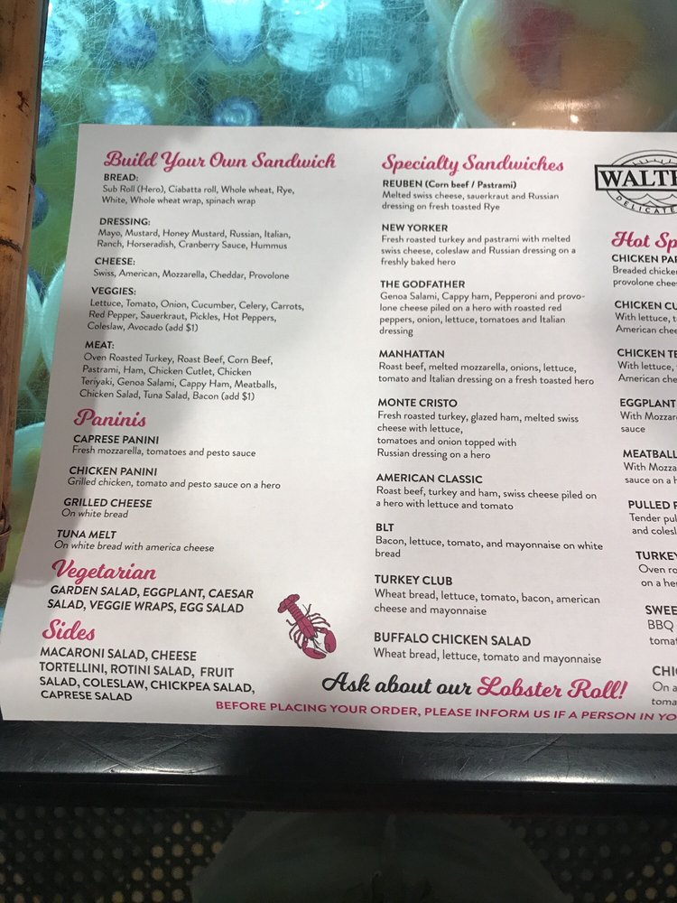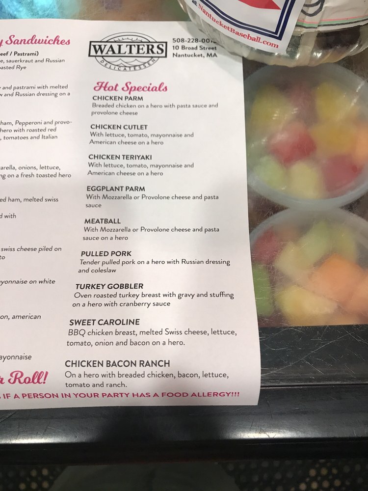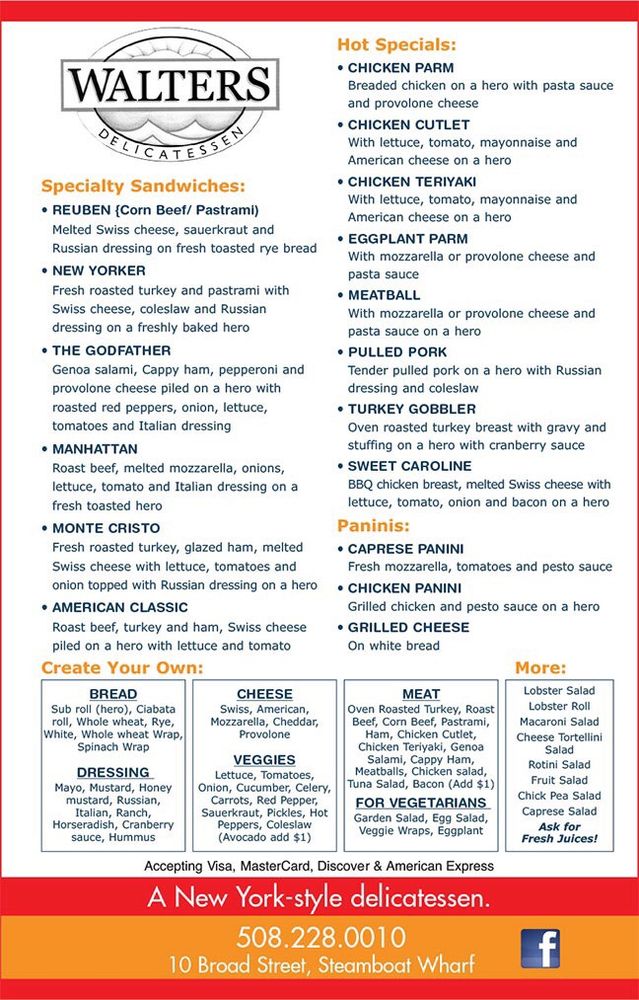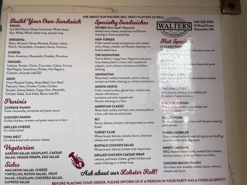 Introducing the menu at Walter's Deli, located in Nantucket, MA, offers a variety of delicious deli sandwiches and salads. Specializing in hot specials like Chicken Parm and Pulled Pork, their menu also includes the classic Walter's Salad with a choice of dressings. Specialty sandwiches like the American Classic and Monte Cristo satisfy a variety of tastes. Reviews praise the generous portions, fast service, and tasty lobster rolls. The lobster salad is highlighted for its fresh, flavorful meat and perfectly toasted bun. For those craving Italian flavors, the Godfather sub is a popular choice. With a cozy atmosphere and excellent customer service, Walter's Deli is a must-visit spot for a satisfying meal on the island.